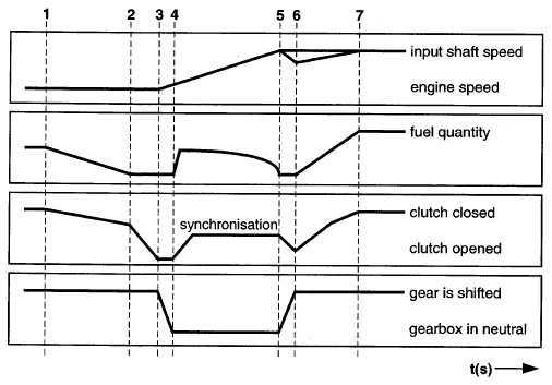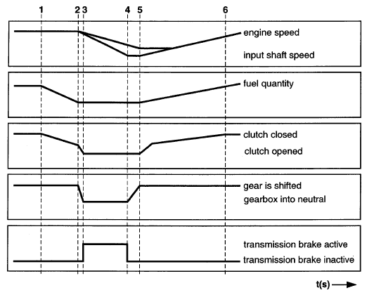 1. При включении повышающей передачи сцепление уже частично выключилось, таким образом, позднее оно может выключиться полностью так быстро, как это возможно. Одновременно, крутящий момент двигателя ограничивается посредством уменьшения количества впрыскиваемого топлива.