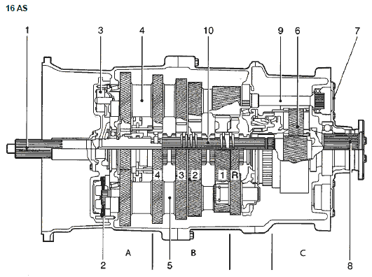 Два дополнительных вала обеспечивают благоприятное распределение крутящего момента от двигателя и снижают механическую нагрузку на шестерни. Данная конструкция обеспечивает компактность и низкий вес коробки передач. На нижеприведенных чертежах показана коробка передач с 12 или 16 передачами.