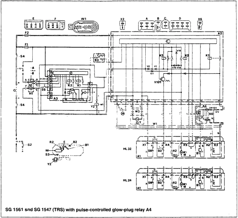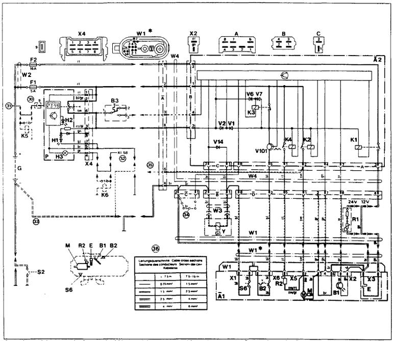 - 33 broken lines are alternatives, relays K5 and K6 only when battery switch S2 is used