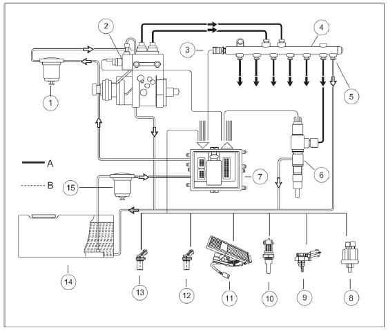 1. Common-rail fuel injection system comprises of low-pressure oil line, high-pressure oil line, information collecting part and control & executive component. Low-pressure oil line includes oil tank, fuel coarse filter with manual fuel pump, low-pressure fuel feed pump and fuel fine filter.