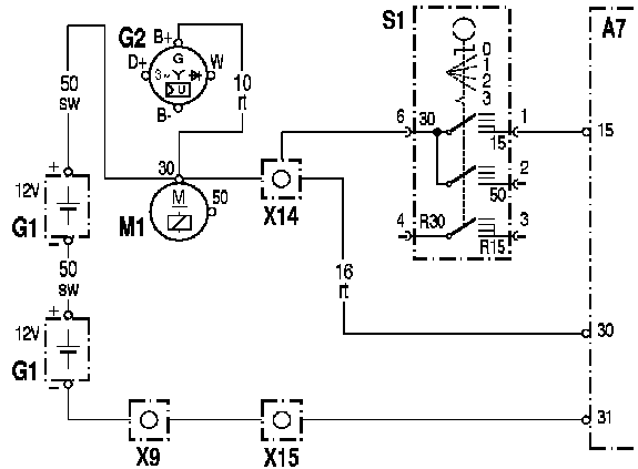 - Х14 : Колодка клеммы 30 на плате штекеров 'Кабина водителя - шасси'