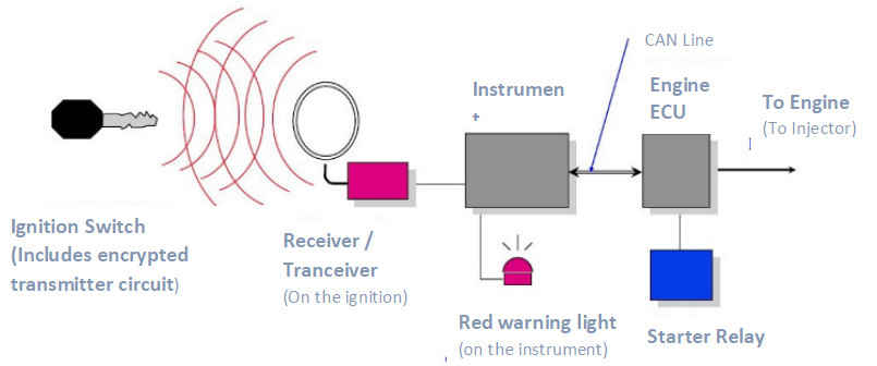 - It communicates with Engine ECU via CAN. It does not allow operation of starter and fuel injection systems if it detects non-matching codes.