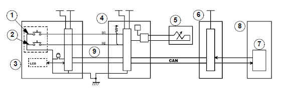 2. The electronic control box (4) transmits the selected mode to the control screen (LCD) via series communications (9). The control screen shows the mode selected.