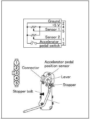• Измерьте выходную мощность контактов 2 и 5 (датчик 1) и выходную мощность контактов 1 и 2 (датчик 2) при положении рычага акселератора в каждой указанной позиции.