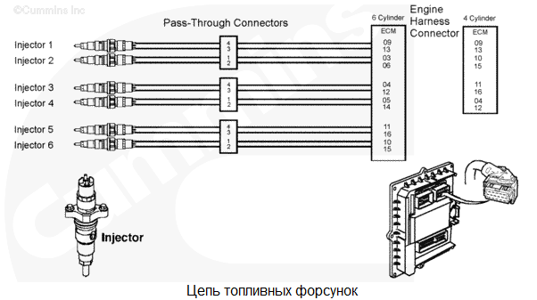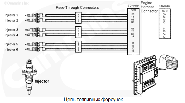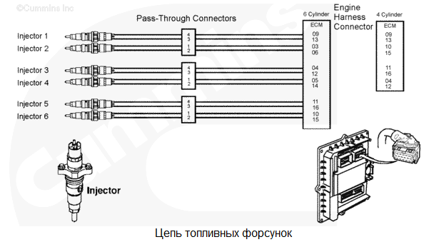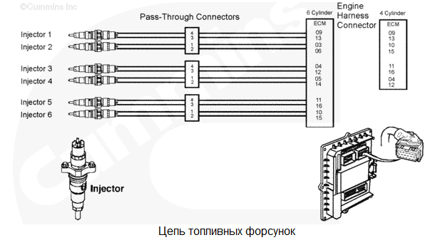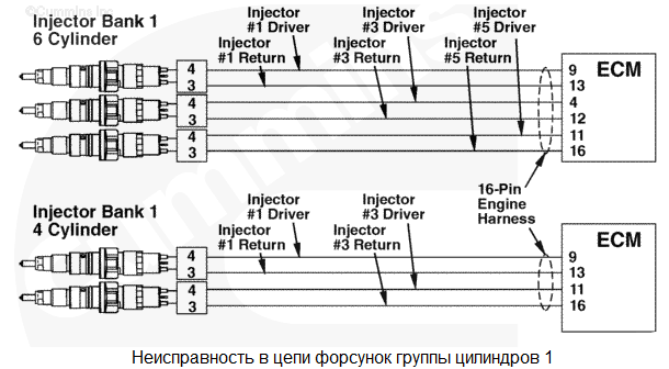 В цепи форсунок группы цилиндров 2 обнаружено короткое замыкание. У 6-цилиндровых двигателей группа цилиндров 2 включает в себя цилиндры 2, 4 и 6. У 4-цилиндровых двигателей группа цилиндров 2 включает в себя цилиндры 2 и 4. Низкая мощность как следствие неправильного порядка работы цилиндров. Характеристика цепи Модуль ECM управляет электромагнитными клапанами форсунок для регулирования подачи топлива и момента впрыска. Каждый электромагнитный клапан форсунки соединен с модулем ECM с помощью провода цепи реле и провода "массы". Электрический импульс посылается на форсунку из модуля ECM по проводу цепи реле и возвращается в модуль ECM по проводу "массы" после включения электромагнитного клапана. Каждый электромагнитный клапан нормально закрыт и открывается только при поступлении электрического импульса от модуля ECM в ходе дозирования и впрыскивания топлива. Местонахождение узла Форсунки расположены под крышкой клапанного механизма. Практические советы
