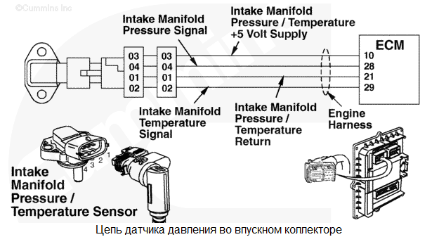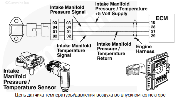 На контакте сигнальной цепи датчика давления во впускном коллекторе обнаружено высокое напряжение. Номинальные рабочие характеристики двигателя могут снизиться до уровня топливоподачи без турбонаддува. Характеристика цепи Этот датчик давления/температуры контролирует давление во впускном коллекторе, передавая данные модулю ECM по жгуту проводов двигателя. Слишком высокая величина давления во впускном коллекторе приведет к переходу двигателя в режим пониженной мощности. Местонахождение узла Датчик температуры/давления воздуха во впускном коллекторе расположен на впускном коллекторе. Практические советы