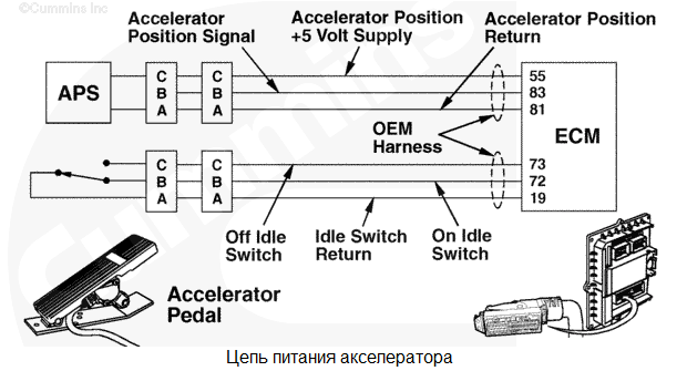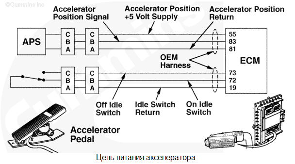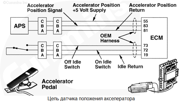 Напряжение питания акселератора более 5,5 В постоянного тока. Используется стандартное значение для акселератора. В аварийном режиме акселератор будет использоваться электронным модулем управления (ECM). Характеристика цепи При нажатии педали акселератора водителем на модуль ECM педаль акселератора подает команду через жгут проводов комплектного оборудования и через жгут проводов интерфейса комплектного оборудования. Модуль ECM использует этот сигнал для управления подачей топлива. Местонахождение узла Местонахождение педали акселератора зависит от производителя комплектного оборудования. Руководство по диагностике неисправностей и ремонту комплектного оборудования Практические советы Датчик положения акселератора представляет собой потенциометр. Для него предусмотрены следующие номинальные характеристики сопротивления.