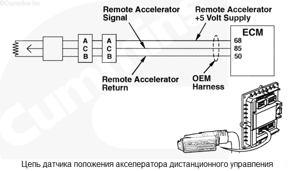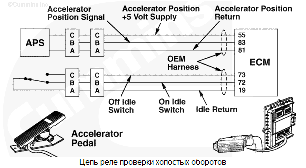Для работы акселератора дистанционного управления его выключатель должен быть во включенном положении. Неисправность может возникнуть из-за обрыва в цепи "массы", короткого замыкания на +5 В или +12 В постоянного тока, из-за неисправности датчика положения акселератора дистанционного управления или из-за неисправности цепи питания модуля ECM. |
