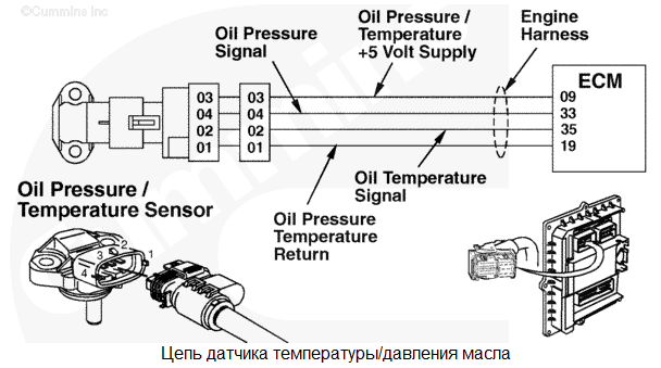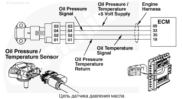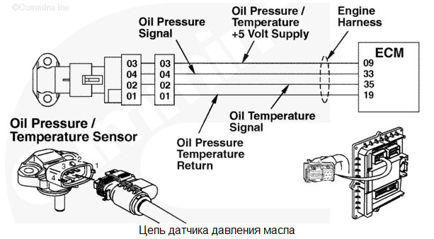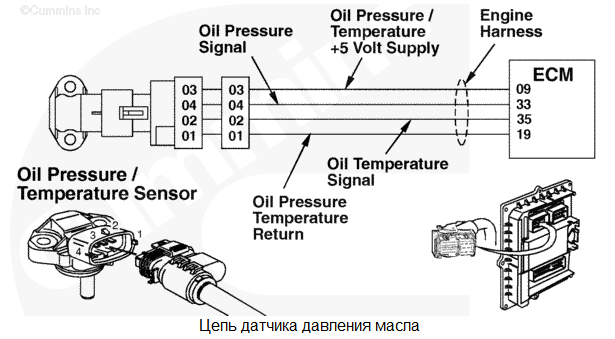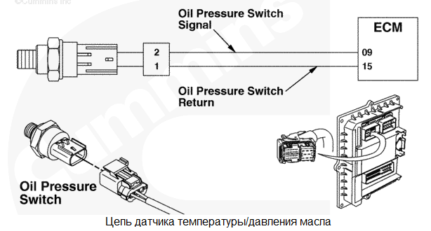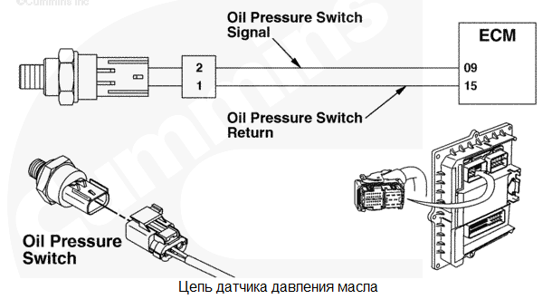 На контакте № 9 жгута проводов двигателя обнаружено низкое напряжение. Для давления масла используется значение по умолчанию. Защита двигателя по давлению масла отсутствует. Характеристика цепи Это реле давления масла используется модулем ECM для контроля давления смазочного масла. Местонахождение узла Реле давления масла расположено на блоке цилиндров, ниже и правее модуля ECM. Практические советы