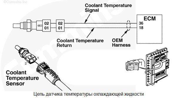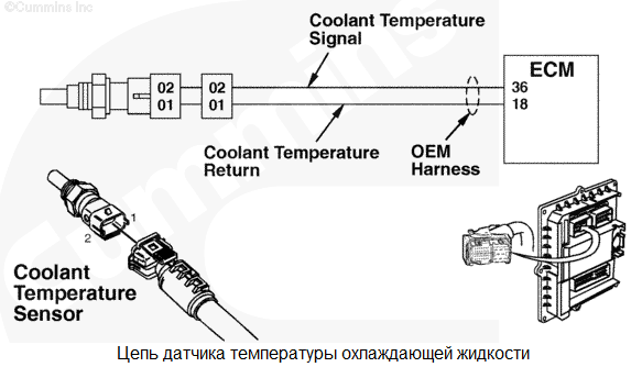 На контакте сигнальной цепи температуры охлаждающей жидкости обнаружено высокое напряжение сигнала. В качестве температуры охлаждающей жидкости используется стандартное значение. Защита двигателя по температуре охлаждающей жидкости отсутствует. Характеристика цепи Датчик температуры охлаждающей жидкости используется электронным модулем управления (ECM) для контроля температуры охлаждающей жидкости двигателя. Температура охлаждающей жидкости используется модулем ECM для синхронизации и управления подачей топлива. Местонахождение узла Датчик температуры охлаждающей жидкости расположен на передней поверхности корпуса термостата. Практические советы Если показания датчика соответствуют значениям в следующей таблице, то датчик работает нормально. ![]() |