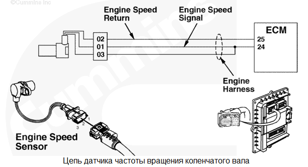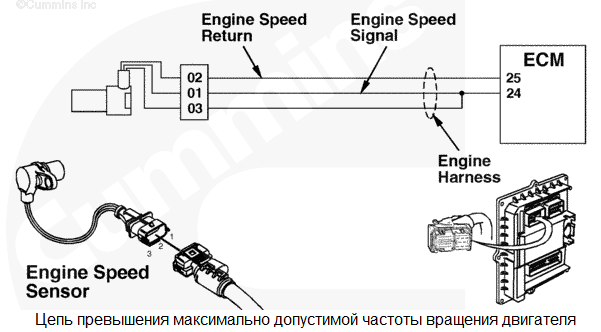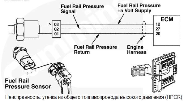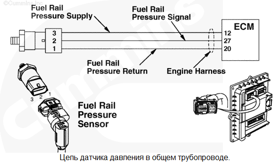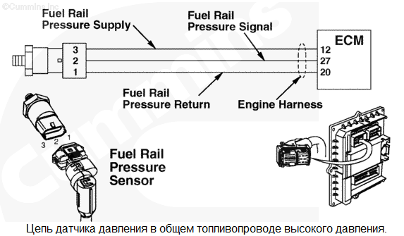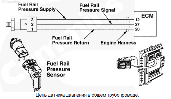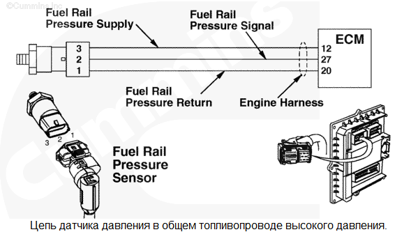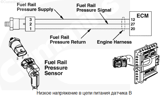 Цепь датчика давления в общем топливопроводе высокого давления 1 - Напряжение ниже нормы или короткое замыкание на цепь низкого напряжения. В цепи датчика давления в общем топливопроводе высокого давления обнаружено низкое напряжение сигнала. Снижение номинальных значений мощности и/или частоты вращения двигателя. Характеристика цепи Этот датчик используется электронным модулем управления (ECM) для контроля давления в общем топливопроводе высокого давления. Он подключен к цепи питания напряжением +5 В, идущей от модуля ECM, и к контакту цепи "массы". Третий контакт используется для подключения сигнальной цепи. Цепи питания и "массы" используются им совместно с остальными электроприборами двигателя. Местонахождение узла Датчик давления в общем топливопроводе установлен в общем топливопроводе. Место расположения узла показано в Процедуре 100-002. Практические советы Этот код неисправности становится пассивным при каждом повороте пускового включателя в положение "ВКЛ.", когда напряжение на контакте сигнальной цепи модуля ECM становится слишком низким. Это может быть вызвано замыканием на "массу" проводки цепи питания (+5 В) или сигнальной цепи. Кроме того, этот код неисправности может стать активным при замыкании на "массу" электроприбора, подключенного к общей цепи питания +5 В. Этот код неисправности становится пассивным при каждом повороте пускового включателя в положение ВКЛ., когда напряжение сигнальной цепи приходит в норму. Возможные причины появления этого кода неисправности: