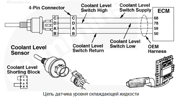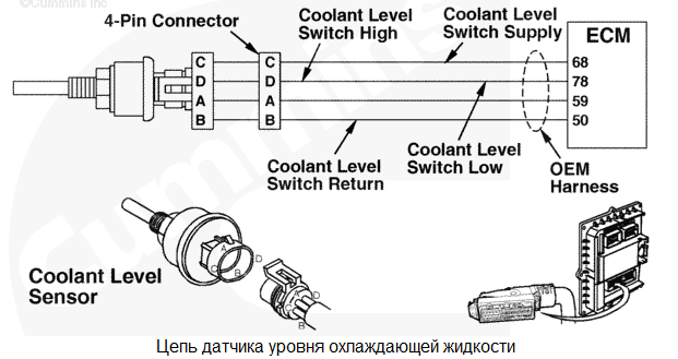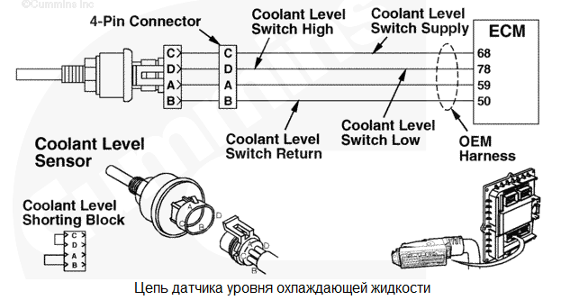 Сигнал уровня охлаждающей жидкости двигателя указывает на то, уровень охлаждающей жидкости достиг значения, при котором срабатывает система защиты двигателя. Снижение мощности и (или) частоты вращения и возможный останов двигателя, если включена функция защитного останова. Характеристика цепи Этот датчик контролирует уровень охлаждающей жидкости в системе охлаждения, передавая данные на электронный модуль управления (ECM). Местонахождение узла Датчик уровня охлаждающей жидкости устанавливается производителем комплектного оборудования. Для определения местонахождения датчика используйте руководство производителя комплектного оборудования. Практические советы
