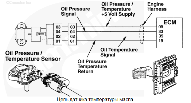 На линии питания электронного модуля управления (ECM), ведущей к датчику давления/температуры масла, обнаружено низкое напряжение. Для датчика давления/температуры масла стандартное значение, связанное с этим источником питания, +5 В постоянного тока. Защита двигателя по давлению масла отсутствует. Характеристика цепи Датчик давления/температуры масла используется модулем ECM для контроля давления и температуры смазочного масла. Модуль ECM считывает напряжение на сигнальных контактах, преобразуя его в давление и температуру. Местонахождение узла Датчик температуры/давления масла расположен на блоке цилиндров, ниже выпускного коллектора, вблизи корпуса масляного фильтра. Практические советы