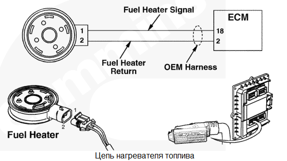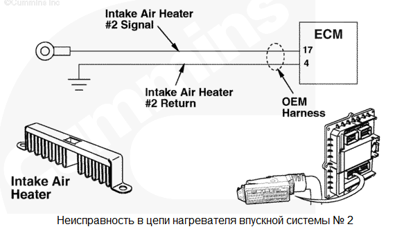 Обнаружена неисправность в цепи включения реле вспомогательного пускового устройства № 2. Постоянное включение-выключение или повреждение нагревателя впускной системы № 2. Характеристика цепи Нагреватель впускной системы упрощает запуск и снижает уровень белого дыма в холодную погоду. Модуль ECM управляет реле, которое подает питание на нагреватель. В нагревателе установлены две нагревательные спирали, управляемые модулем ECM по отдельности. Местонахождение узла Нагреватель впускной системы расположен у впускного воздушного патрубка внутри впускного коллектора. Место расположения реле нагревателя может быть различным для разных типов комплектного оборудования. Практические советы