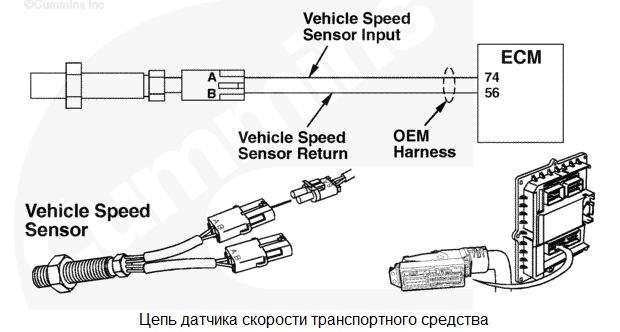 Отсутствие сигнала датчика скорости транспортного средства. Частота вращения двигателя не превышает максимального значения. Частота вращения двигателя без датчика скорости. Системы круиз-контроля, защитного включения понижающей передачи и регулятора скорости не будут работать. Данные о поездке, вычисляемые на основании пробега, будут неправильными. Характеристика цепи В датчике скорости транспортного средства (VSS) предусмотрены две отдельные катушки индуктивности (на некоторых двигателях используется датчик скорости с одной катушкой индуктивности) для подсчета импульсов, возникающих при прохождении зубьев шестерни вблизи датчика. Одна катушка используется электронным модулем управления (ECM) для определения скорости передвижения. Вторая катушка иногда используется комплектным оборудованием для отправки сигнала датчика скорости на спидометр. Местонахождение узла Чаще всего датчик скорости расположен в задней части коробки передач. Практические советы