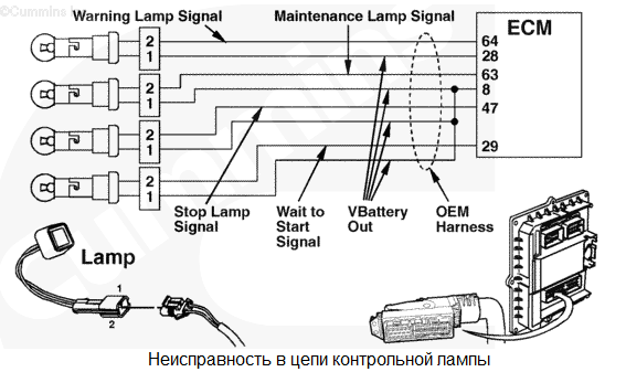 В одной или нескольких цепях контрольных ламп обнаружена неисправность. Это может быть обрыв цепи или короткое замыкание на полюс аккумуляторной батареи или на "массу" цепи какой-либо контрольной лампы, за исключением лампы предупреждения. Если причина в обрыве цепи или коротком замыкании на полюс аккумуляторной батареи, то при повороте пускового включателя в положение "ВКЛ." контрольная лампа не загорится. При коротком замыкании на "массу" контрольная лампа будет гореть постоянно. Характеристика цепи Электронный модуль управления (ECM) проводит диагностические проверки большинства своих цепей и при обнаружении в них отказа выдает код неисправности. Появление определенных кодов неисправностей приводит к включению контрольной лампы для оповещения водителя об отказе. Местонахождение узла Как правило, контрольная лампа расположена на приборной панели в кабине машины. Практические советы Обычно эта неисправность указывает на короткое замыкание на цепь питания от аккумуляторной батареи. Она не отображается числом миганий лампы предупреждения. Ее можно считать с помощью диагностического комплекта INSITE™ и по числу миганий желтых ламп, отображающих код неисправности. Появление этого кода неисправности может быть вызван неисправностью любой контрольной лампы (ожидания запуска, аварийной остановки и техобслуживания), за исключением лампы предупреждения. |