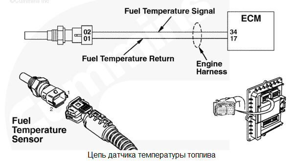 На контакте сигнальной цепи температуры топлива обнаружено высокое напряжение сигнала. Для температуры топлива используется значение по умолчанию. Возможно снижение мощности. Характеристика цепи Датчик температуры топлива используется электронным модулем управления (ECM) для контроля температуры подаваемого топлива. Если температура топлива чрезмерно высока, а система защиты двигателя включена, то может произойти снижение частоты вращения двигателя или даже его остановка. Местонахождение узла Датчик температуры топлива расположен на корпусе топливного фильтра. Практические советы Чтобы проверить правильность работы датчика, сравните его показания со значениями, приведенными в следующей таблице. ![]() |