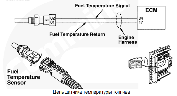 На контакте сигнальной цепи температуры топлива обнаружено низкое напряжение сигнала. Для температуры топлива используется значение по умолчанию. Возможно снижение мощности. Характеристика цепи Датчик температуры топлива используется электронным модулем управления (ECM) для контроля температуры подаваемого топлива. Если температура топлива чрезмерно высока, а система защиты двигателя включена, то может произойти снижение частоты вращения двигателя или даже его остановка. Местонахождение узла Датчик температуры топлива расположен на корпусе топливного фильтра. Практические советы Чтобы проверить правильность работы датчика, сравните его показания со значениями, приведенными в следующей таблице. ![]() |