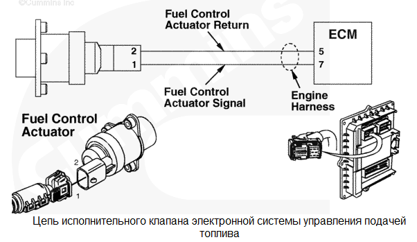 В цепи исполнительного клапана электронной системы управления подачей топлива обнаружен обрыв. Падение оборотов до калибровочного значения. Характеристика цепи Исполнительный клапан электронной системы управления подачей топлива регулирует количество топлива, поступающего в топливный насос высокого давления. Подачу электропитания на клапан обеспечивает электронный модуль управления (ECM). Исполнительный клапан электронной системы управления подачей топлива является нормально открытым и закрывается только при подаче электропитания. Местонахождение узла Исполнительный клапан электронной системы управления подачей топлива установлен на двигателе со стороны впускного коллектора. Клапан прикреплен к топливному насосу высокого давления, установленному на картере задних распределительных шестерен. Практические советы
