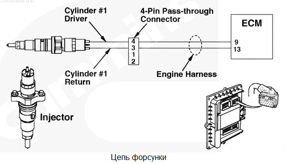 При наличии напряжения на жгуте проводов в цепи форсунки № 1 обнаружено высокое сопротивление или отсутствие тока через контакт цепи реле или цепи "массы" форсунки № 1. Возможно, неправильная работа цилиндра 1. Двигатель может работать неровно. Характеристика цепи Модуль ECM управляет электромагнитными клапанами форсунок для регулирования подачи топлива и момента впрыска. Каждый электромагнитный клапан форсунки соединен с модулем ECM с помощью провода цепи реле и провода "массы". Электрический импульс посылается на форсунку из модуля ECM по проводу цепи реле и возвращается в модуль ECM по проводу "массы" после включения электромагнитного клапана. Каждый электромагнитный клапан нормально закрыт и открывается только при поступлении электрического импульса от модуля ECM в ходе дозирования и впрыскивания топлива. Местонахождение узла Находится по крышкой клапанного механизма. Практические советы