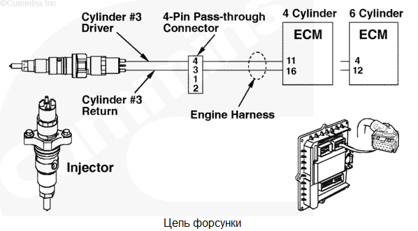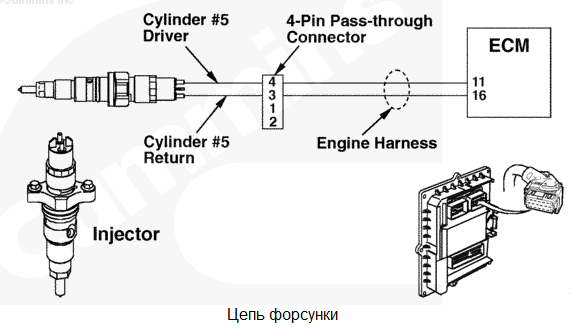 При наличии напряжения на жгуте проводов в цепи форсунки № 4 обнаружено высокое сопротивление или отсутствие тока через контакт цепи реле или цепи "массы" форсунки № 4. Возможно, неправильная работа цилиндра 4. Двигатель может работать неровно. Характеристика цепи Модуль ECM управляет электромагнитными клапанами форсунок для регулирования подачи топлива и момента впрыска. Каждый электромагнитный клапан форсунки соединен с модулем ECM с помощью провода цепи реле и провода "массы". Электрический импульс посылается на форсунку из модуля ECM по проводу цепи реле и возвращается в модуль ECM по проводу "массы" после включения электромагнитного клапана. Каждый электромагнитный клапан нормально закрыт и открывается только при поступлении электрического импульса от модуля ECM в ходе дозирования и впрыскивания топлива. Местонахождение узла Форсунка расположена под крышкой клапанного механизма. Практические советы
