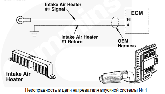 Обнаружена неисправность в цепи включения реле вспомогательного пускового устройства № 1. Постоянное включение-выключение или повреждение нагревателя впускной системы № 1. Характеристика цепи Нагреватель впускной системы упрощает запуск и снижает уровень белого дыма в холодную погоду. Электронный модуль модуль (ECM) управляет работой реле, которое подает питание на нагреватель. В нагревателе установлены две нагревательные спирали, управляемые модулем ECM по отдельности. Местонахождение узла Нагреватель впускной системы расположен у впускного воздушного патрубка внутри впускного коллектора. Место расположения реле нагревателя может быть различным для разных типов комплектного оборудования. Практические советы