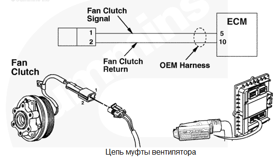 В цепи муфты вентилятора обнаружена неисправность. Вентилятор постоянно включен, выключен или поврежден. Характеристика цепи Электронный модуль управления (ECM) может управлять вентилятором системы охлаждения, используя входные сигналы датчика температуры охлаждающей жидкости и датчика температуры воздуха во впускном коллекторе. Местонахождение узла Муфта вентилятора расположена на передней поверхности двигателя. Практические советы С некоторых устройств на модуль ECM также поступают входные сигналы для охлаждения вспомогательных устройств (например, давление в кондиционере, температура гидроусилителя, температура коробки передач) или предусмотрен ручной выключатель для управления вентилятором. Убедитесь в том, что эти функции и параметры правильно настроены для управления вентилятором. |