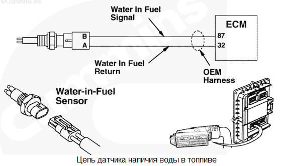 В датчике наличия воды в топливе обнаружена неисправность. Наличие воды в топливе не определяется. Характеристика цепи Датчик наличия воды в топливе установлен на водоотделитель комплектного оборудования. При накоплении определенного объема воды в топливном фильтре датчик посылает сигнал в модуль ECM. Цепь датчика состоит из 2 проводов: провода "массы" и сигнального провода. Местонахождение узла Датчик наличия воды в топливе устанавливается в водоотделитель комплектного оборудования и поставляется производителем комплектного оборудования машины. Для определения местонахождения узлов используйте руководство производителя комплектного оборудования. Практические советы Датчик наличия воды в топливе не входит в состав топливного фильтра двигателя, т.к. используется топливный фильтр высокого давления. Водоотделитель поставляется производителем комплектного оборудования. |