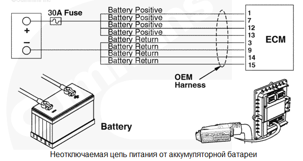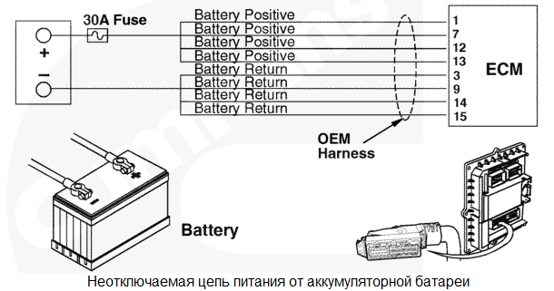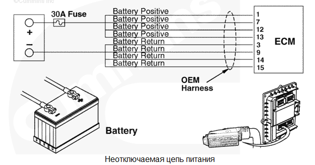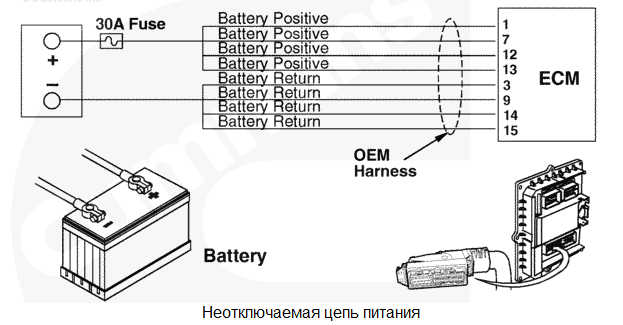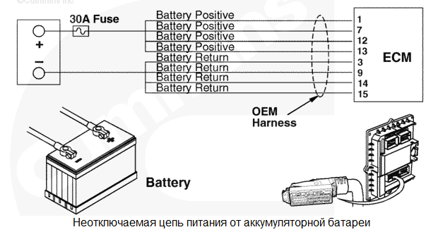 При последнем повороте пускового включателя в положение "ВЫКЛ." все данные, собранные модулем ECM с момента последнего поворота пускового включателя в положение "ВКЛ.", в постоянную память не сохранились. Влияние на рабочие характеристики отсутствует. Данные о кодах неисправностей, поездках и техобслуживании могут быть неточными. Характеристика цепи На модуль ECM постоянно подается напряжение от аккумуляторных батарей по неотключаемому проводу, подсоединенному напрямую к положительному выводу аккумуляторной батареи. Для защиты жгута проводов двигателя от перегрева в проводах неотключаемой цепи питания установлен один предохранитель на 30 А или два линейных предохранителя на 15 А. На модуль ECM подается напряжение от аккумуляторной батареи по прерываемой цепи через пусковой включатель, когда он находится во включенном положении. Провода "массы" аккумуляторной батареи напрямую подсоединены к отрицательной (-) клемме аккумуляторной батареи. Местонахождение узла Модуль ECM подключен к аккумуляторной батареи через жгут проводов комплектного оборудования. Тем самым обеспечивается бесперебойное электропитание модуля ECM. Место установки аккумуляторной батареи зависит от типа используемого комплектного оборудования. Используйте документацию на комплектное оборудование. Практические советы