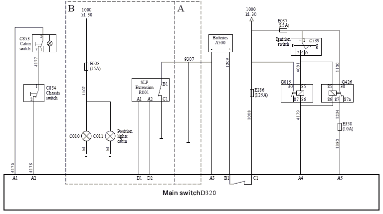 Переключатели C853 и C854 включаются последовательно. Когда оба переключателя замкнуты, питание подается через контакт A1 на контакт A2 блока главного выключателя. На реле внутри блока главного выключателя подается питание.