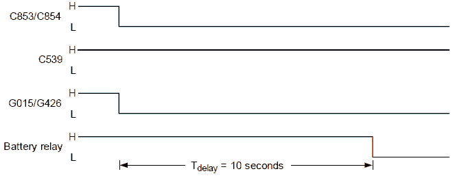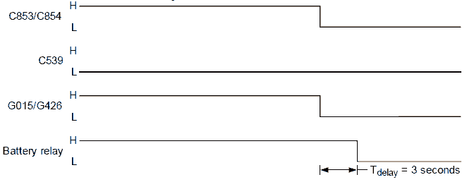 Чтобы безопасно выключить электрические системы, определяется задержка между моментом выключения зажигания автомобиля (C539) и моментом выключения главного выключателя. Продолжительность такой задержки при выключении зависит от состояния зажигания автомобиля