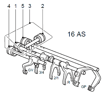 Модулятор управляет внутренними электромагнитными клапанами. Электромагнитные клапаны, в свою очередь, управляют внутренними поршнями, которые работают под давлением воздуха (1, 2, 4 и 5), за счет чего валы селектора обеспечивают включение и выключение соответствующей передачи.