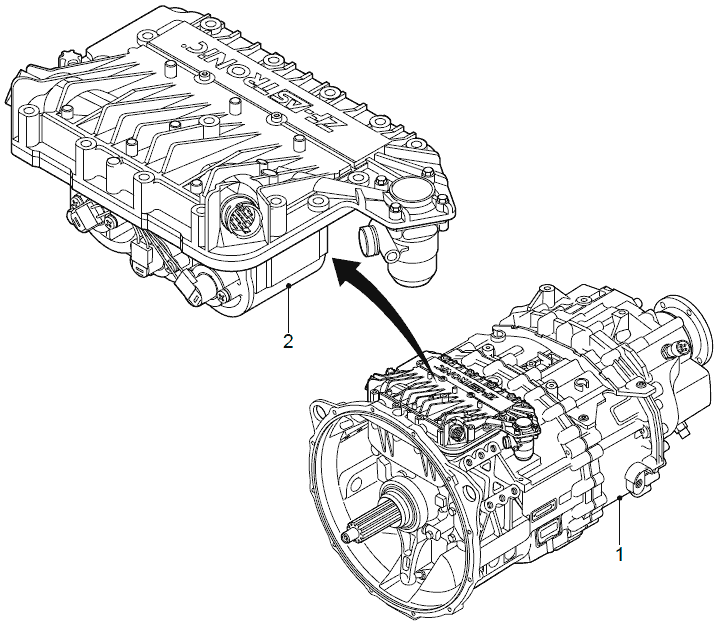 Модулятор коробки передач (2) встроен в кожух коробки передач (1) (для экономии места) и содержит все механические, электрические и пневматические соединения, необходимые для правильного переключения передач.