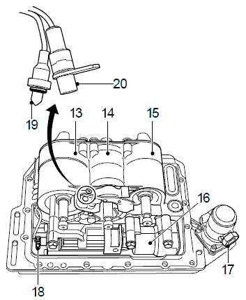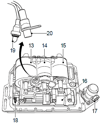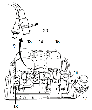 Для проверки соответствия перемещения цилиндров зацепления на них установлены датчики движения (3, 4, 5 и 18). Модулятор коробки передач состоит из следующих датчиков движения: