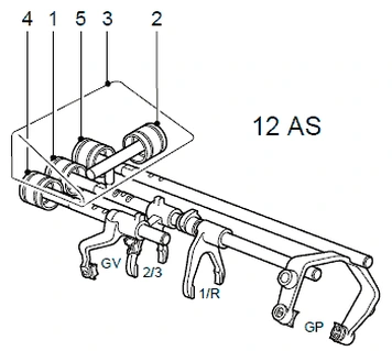 Управление разделительной муфтой (GV) осуществляется с помощью цилиндра зацепления (4).