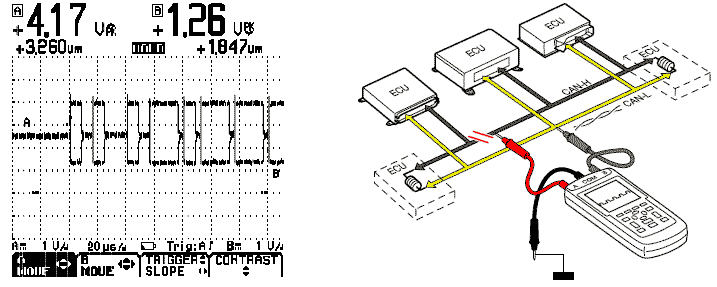 1. Отсоедините первый ECU соответствующей сети CAN. Если изображение осциллографа изменится на изображение сигнала исправной CAN, отсоединенный ECU являлся причиной проблемы.