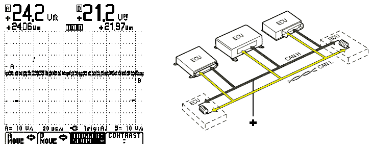 В зависимости от расположения переходного сопротивления в линии CAN относительно ECU, подающего сигнал, сигнал является нормальным или инвертированным.