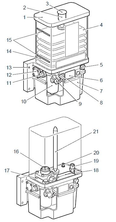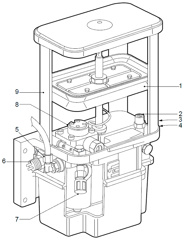 Когда резервуар заполняется смазкой в нижней части, воздух над поршнем ведомого механизма выходит. Этот воздух подается вниз через отверстие в направляющей поршня и выходит из насоса через квадратное соединение (4). Как правило, во время вентиляции небольшое количество смазки вытекает из такого соединения.