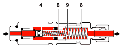 Когда насос останавливается, и давление смазки падает, плунжер (4) возвращается назад под давлением