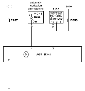 Управление автоматической системой смазки (AGS) осуществляется с помощью таймера в блоке управления, который подает импульс в заранее установленное время. После подачи импульса двигатель насоса включается на время одного цикла смазки. Время задержки между последующими циклами смазки также задается предварительно в блоке управления Если зажигание автомобиля выключить во время цикла смазки, полный цикл смазки начнется повторно после включения зажигания.