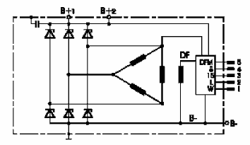 У генератора имеется два контактных вывода В+, внутренне соединенные друг с другом. В+1 подсоединен к клемме 30 на стартере. Контактный вывод В+2 НЕ подсоединен. Контактный вывод В- («масса») соединен с корпусом генератора.