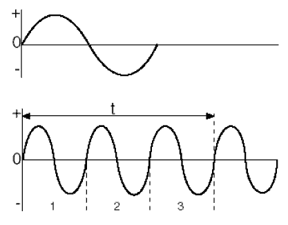 Количество полных синусоид в секунду является частотой сигнала (на схеме 3 Гц)