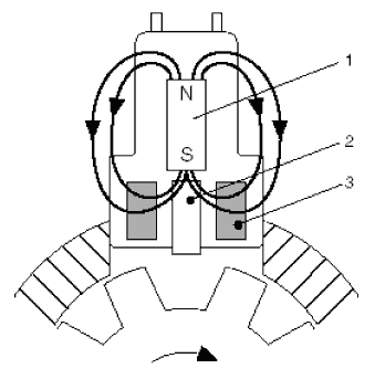 Значение создаваемого напряжения переменного тока зависит от частоты вращения зубчатого колеса и воздушного зазора между датчиком (сердечником) и зубцом.