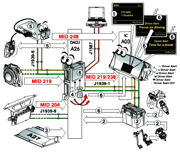 Блок DACU имеет собственные коды неисправностей и обрабатывает все коды неисправностей для систем DAS и LKS. Блок DACU выдает отклик на номер MID систем DAS и LKS по диагностическому каналу J1587.
