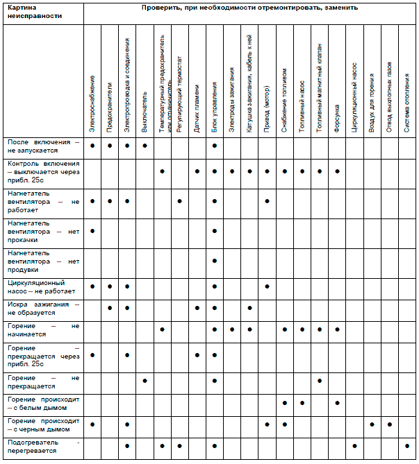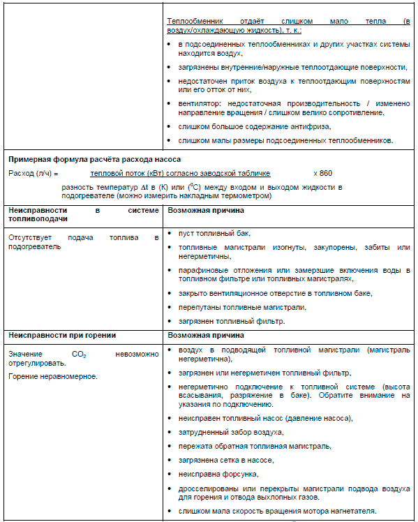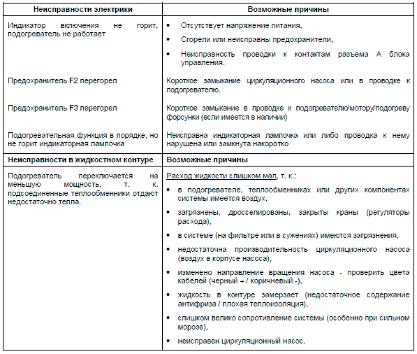 Распознание неисправностей ограничивается, как правило, определением того, какие компоненты вышли из строя. Нижеследующие причины неисправностей не упоминаются потому, что подогреватели необходимо всегда проверять на наличие этих причин, или, соответственно, нужно быть уверенным, что неисправность произошла не по одной из них.