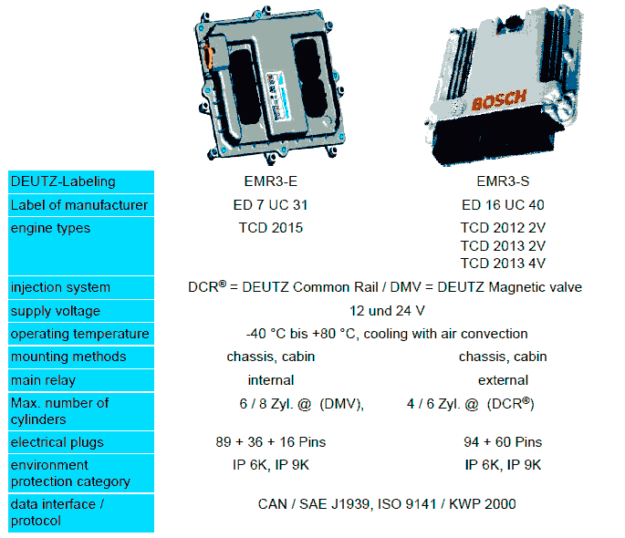 ´The KWP2000 protocol cannot be viewed and can only be used by the DEUTZ diagnosis software SERDIA. The SAE-J-1939 protocol on the other hand is internationally standardised and can be used with any CAN diagnosis hardware and software. For this, standard messages are selected from the set of the SAE-J-1939 protocol by DEUTZ via control unit parameterization which are sent regularly to the bus by the control unit. The configuration of the CAN messages is determined in predefined CAN function scopes from which the customer selects a suitable one for the engine application when ordering the engine. An adaptation of the CAN messages to individual conditions is only possible in agreement with the DEUTZ head office.