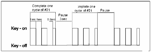b. Контрольная лампа двигателя мигает, отображая первую цифру кода неисправности, затем пауза, а потом начнет снова мигать, показывая вторую цифру кода неисправности. Например, если код неисправности «21», индикаторная лампа двигателя мигнет дважды (первая цифра «2»), затем пауза - 1 сек, затем мигнет снова (вторая цифра «1»). Цикл повторится, чтобы более ясно отобразить код неисправности.