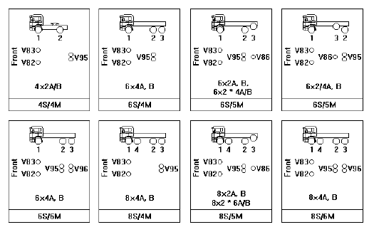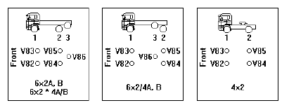 На приведенных ниже иллюстрациях показаны варианты колесных формул автомобиля и варианты размещения модуляторов системы.