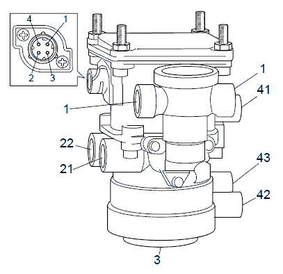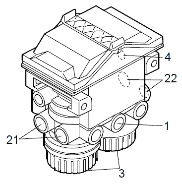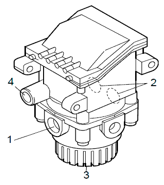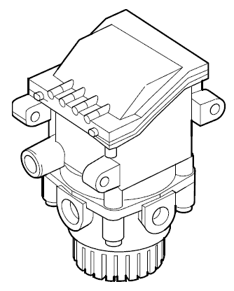 Электромагнитный клапан увеличения давления пропускает необходимое количество сжатого воздуха, для того чтобы установить в управляющей магистрали прицепа требуемое давление. Величина