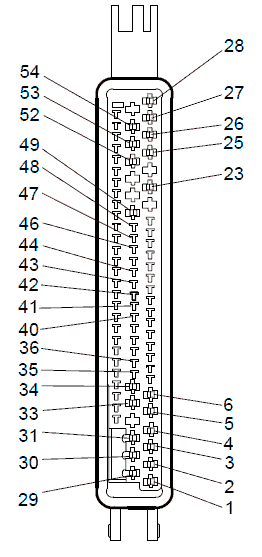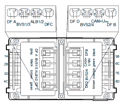 • В разъеме B находятся выводы для соединения с аналоговыми элементами системы, например, выводы для электрического питания и сигналов потенциометров тормозного крана.